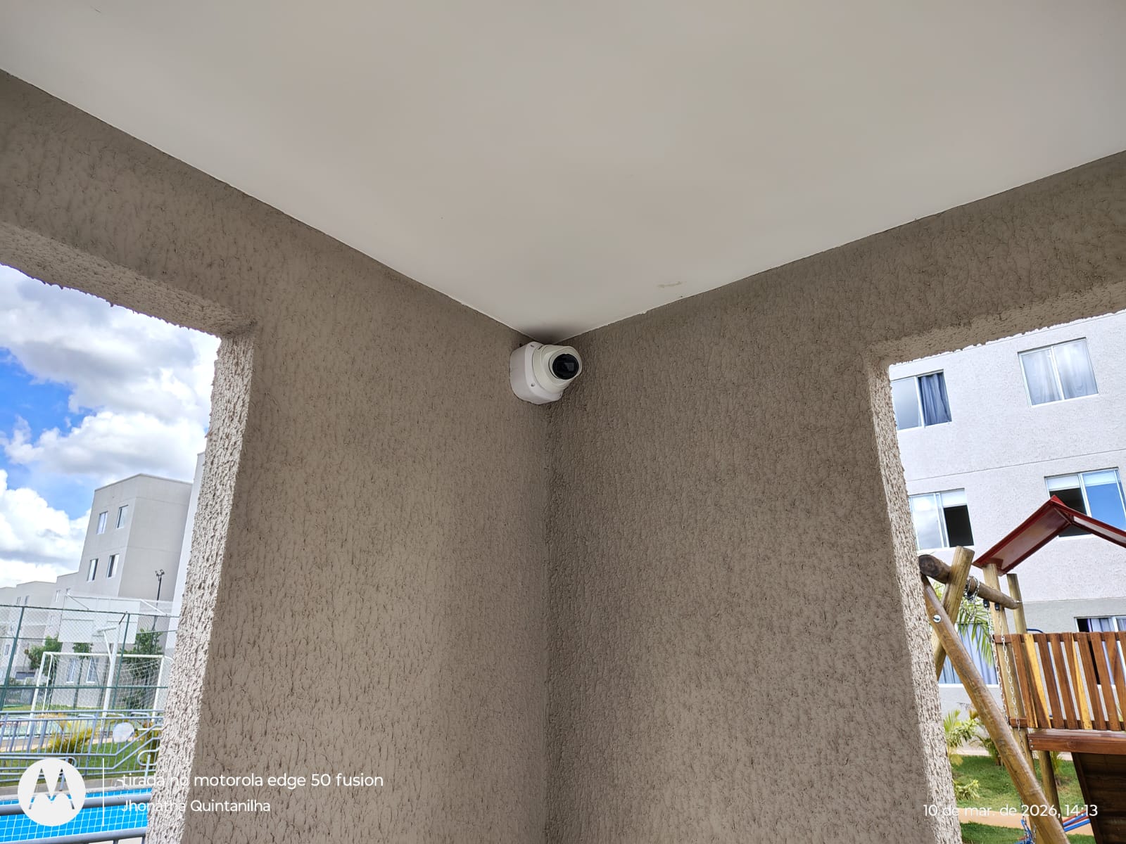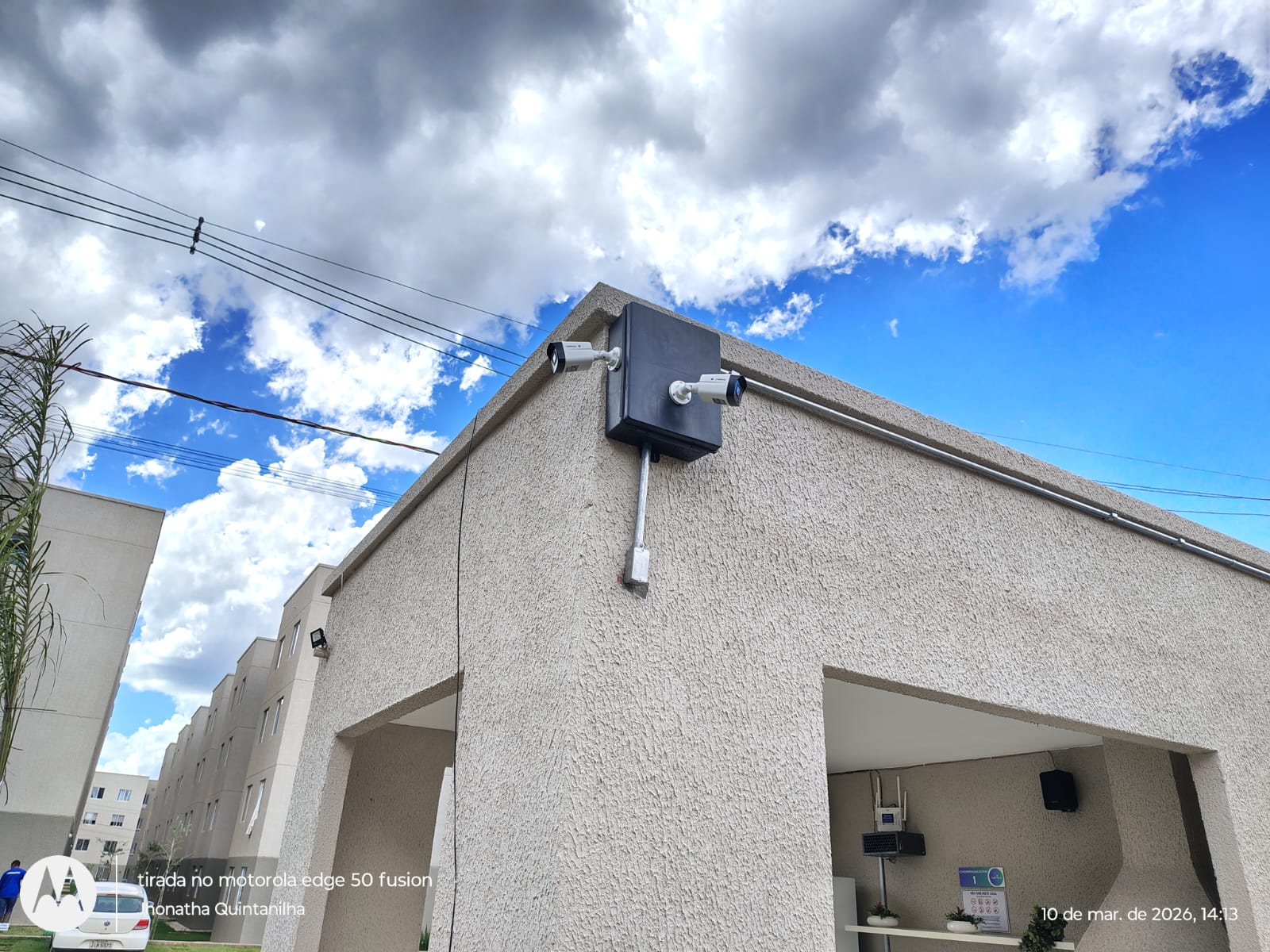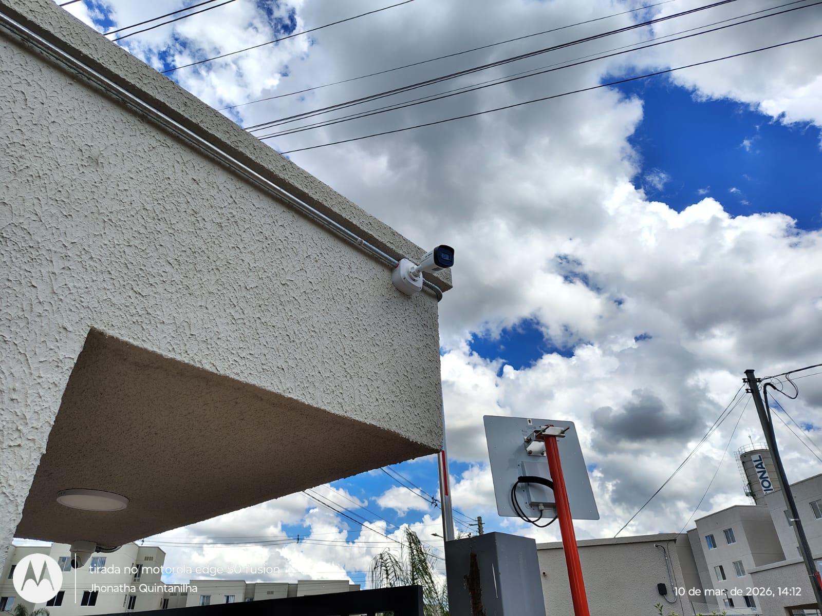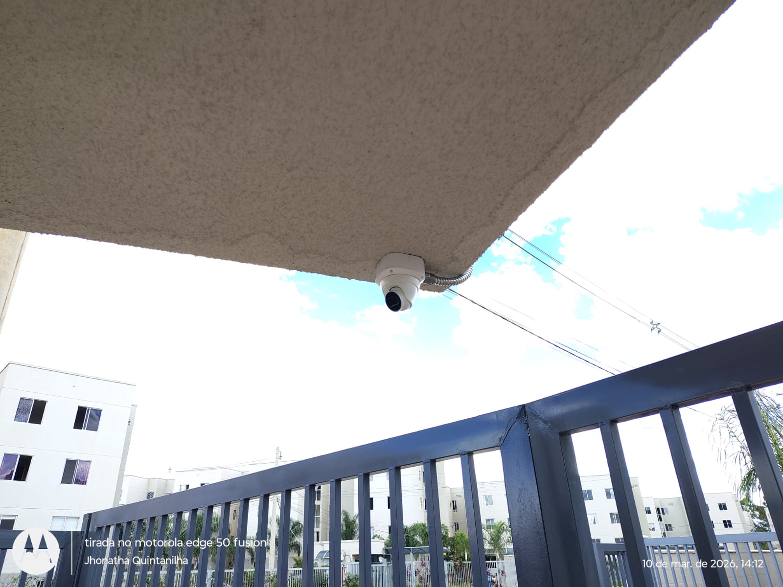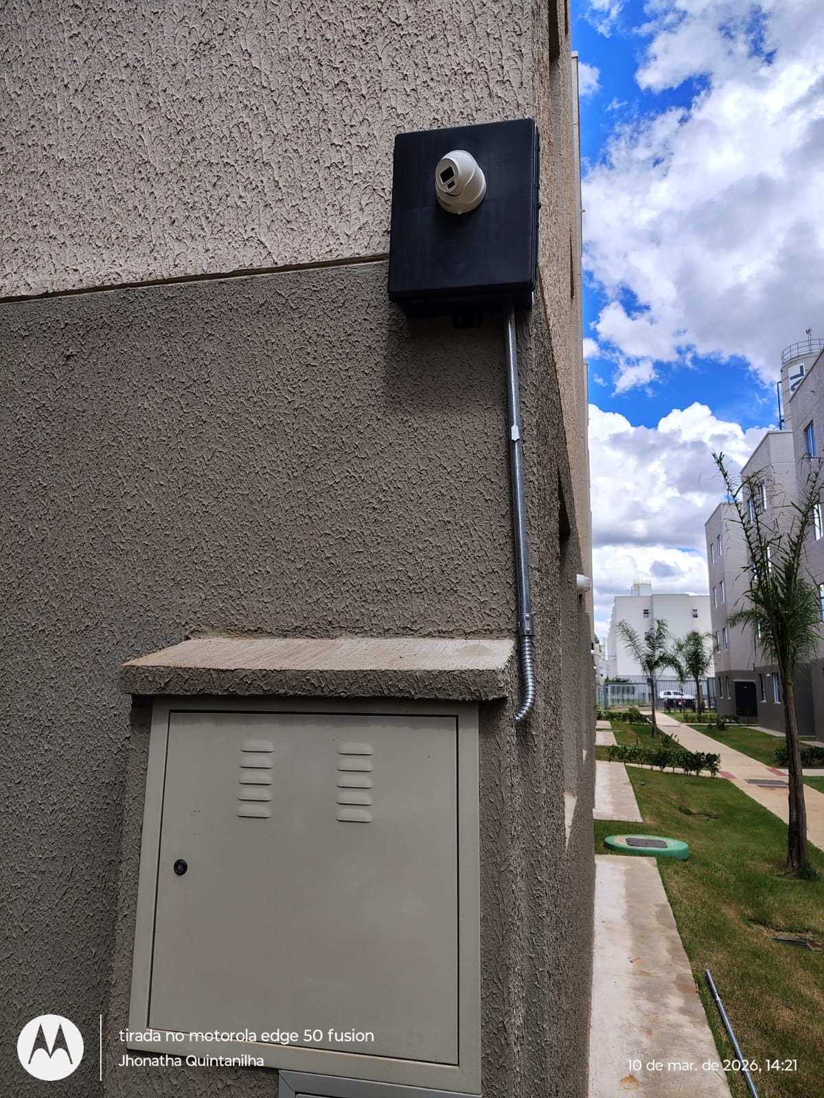 Câmera instalada na porta do bloco com infra em galvanizado e caixa hermetica